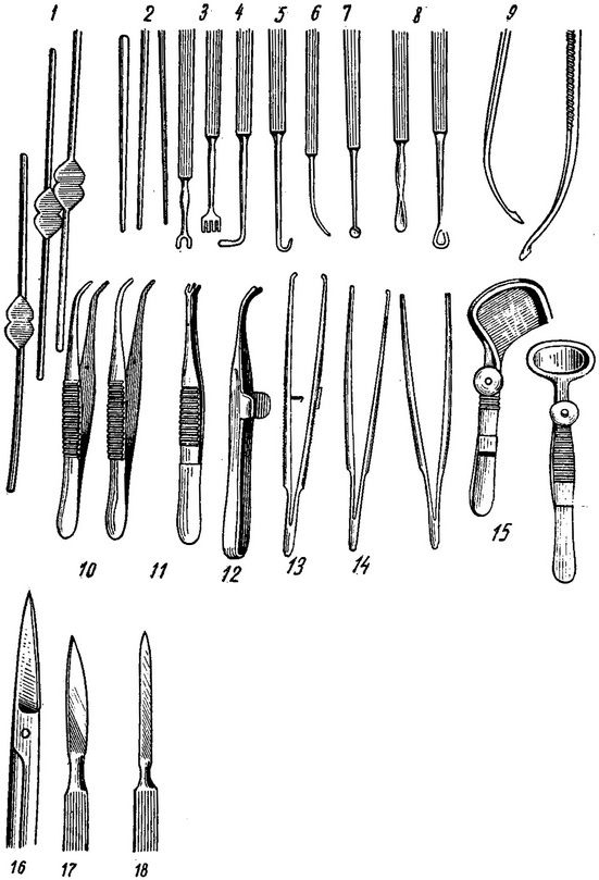 Рис. 57. Очної інструментарій. 1 - зонди Боумена; 2 - зонди конічні; 3 - гачки загострені; 4 - гачки для м'язи; 5 - голка Ома; 6 - очної шпатель; 7 - ложечка для видалення халязіона; 8 - ложечка Дэвиэля і петля Вебера; 9 - ложечка Аксенфельда; 10 - пінцети для райдужки; 11 - пінцет Поляка; 12 - капсульний пінцет; 13 - фіксаційний пінцет; 14 - хірургічний і анатомічний пінцети; 15 - пінцети Снеллена (затискачі); 16 - гострі ножиці очні; 17 - очної скальпель; 18 -катарактальный ніж Грефе.