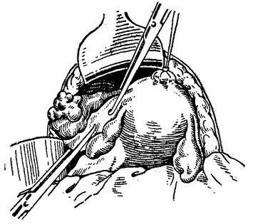 Рис. 48. Операція з приводу трубної вагітності. Накладання затискачів на брижу труби.