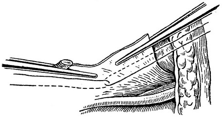 Операція вагінальним шляхом показана при інфікуванні заматочной кров'яної пухлини (гарячковий стан, разложившаяся кров, отримана при пункції тощо) (рис. 52, 53). Оголюють у дзеркалах задній звід піхви, який зазвичай буває випнутих. З допомогою скальпеля звід обережно (через небезпеку поранення кишечника) розкривається впоперек, а потім в отвір вводять корнцанг, з допомогою якого отвір розширюється.