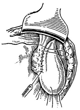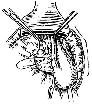 Рис. 50. Накладання затискачів для перитонизации кукси труби. Початок перитонизации.