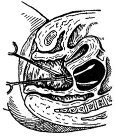 Рис. 52. Пробуравливание заднього склепіння піхви зігнутим гострим корнцангом.