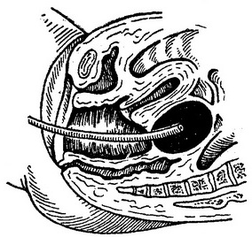 Рис. 53. Дренування дугласова простору введенням товстої гумової трубки.