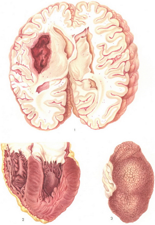 Рис. 1. Крововиливи і кісти в тканини головного мозку. Рис. 2. Гіпертрофія лівого шлуночка серця. Рис. 3. Поверхня дрібнозерниста первинно зморщеної нирки.