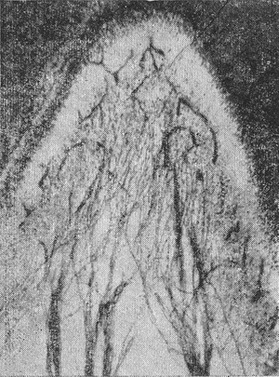![]() Рис. 3. Пучки нервових волокон, що розгалужуються в центральних відділах пульпи першого премоляра дитини 12 років. Коріння сформовані на 2/3. Про. 8, ок. 10 (А. Д. Джафаровой, 1969). |