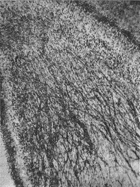 ![]() Рис. 4. Субодонтобластическое нервове сплетіння в області рогу моляра дитини 14 років. Коріння сформовані. Про. 8, ок. 10 (А. Д. Джафаровой, 1969). |