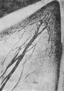 ![]() Рис. 1. Великий пучок нервових волокон, розгалужується в самій вершині пульпи зачатка ікла у дитини 4 міс. Характерна мала кількість відгалужень нервових волокон до периферії пульпи. Про. 10, ок. 2 (А. В. Рукавишникову, 1965). |