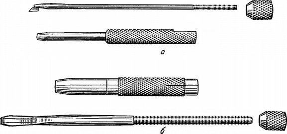 Найбільш точні і найменш травматичні розрізи тканин ока, на думку багатьох хірургів, можна виробляти осколками бритвених лез [Нурмамедова Н. Н., Хаккиев P. X., 1971; Чернова Н. А., 1973; Колесніченко Ю. В., 1976; Chowdhu-ry А. М., 1973]. Наш досвід підтверджує цю думку. Опір тканин при розрізах бритвеним лезом значно менше, ніж при користуванні ножами, тому при переході на їх використання доцільна попередня тренування на очах тварин. Л. Ф. Линник (1967) запропонував для фіксації осколків лез спеціальну ручку-тримач, А. В. Курсиков (1967) - ніж-скарифікатор. Іноземні фірми випускають готові осколки бритвених лез із спеціальної сталі найбільш доцільної форми [Краснов М. М., 1973]. Спочатку ми користувалися лезвиедержателем Кастровьехо - єдиним доступним інструментом цього типу, так як він входить у вітчизняний набір для очної хірургії. Переконавшись у тому, що він має порівняно великі габарити, масу і що працювати з ним важко, ми [Смеловскій А. С., 1976] сконструювали такий інструмент на основі трепана Еліота діаметром 2 мм, ріжучий край якого сточено. З нержавіючої сталі виготовлено стрижень довжиною 27 мм, діаметром близько 2 мм Один кінець стрижня є розрізної двухлепестковой цангою (довжина 10 мм, діаметр 3 мм), що має вигляд конуса. Стрижень вставляють в трепан, на різьбу іншого кінця стрижня нагвинчують гайку. Осколок бритвеного леза поміщають між пелюстками цанги і затискають поворотом гайки (рис. 7 а, 8,а).