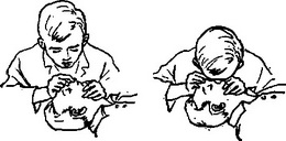 При зупинці дихання вдома, на вулиці, на пляжі і т. п. найбільш ефективний спосіб з рота в рот (мал. 1) або з рота в ніс. Взявши лівою рукою за нижню щелепу хворого, а правою - за тім'яну область або затиснувши нею ніс, максимально закидають голову хворого. Це найкраще положення для звільнення дихальних шляхів від западающего мови. Потім глибоко вдихають повітря собі в легені і вдувають в рот або ніс хворого, знову набирає в легені повітря для наступного вдування і т. д.