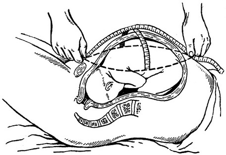 З існуючих методів визначення строку вагітності найбільше розповсюдження в практиці отримав метод А. В. Рудакова, який полягає у вимірюванні величини плоду через зовнішню черевну стінку за допомогою сантиметрової стрічки (рис. 21).