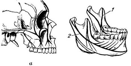 Анатомія і гістологія. На верхній щелепі, в цілому легкої, повітряної, утвореної тонкими пластинками, що обмежують повітроносні шляхи і порожнини, що утворюються більш щільні ділянки компактного речовини, що забезпечують підвищену міцність кістки в напрямках найбільшої напруги від жувального тиску, які носять назву контрфорсів (рис. 2, а).
