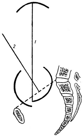 1 - вісь плода; 2 - вісь тазу.