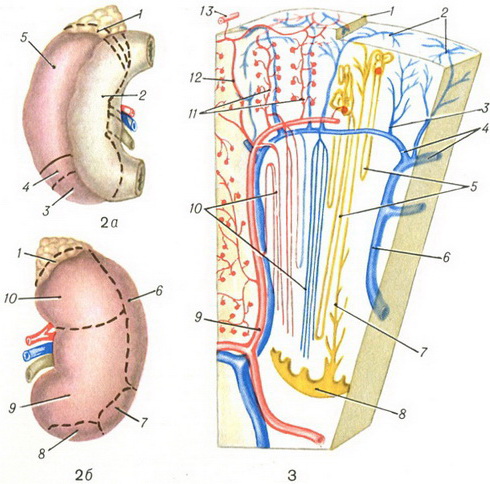 Рис. 2а і 26. Зони зіткнення правої (рис. 1а) і лівої (мал. 16) нирок з сусідніми органами: 1 - надниркова зона; 2 - дуоденальна зона; 3, 4 і 7 - ободової-кишкова зона; 5 - печінкова зона; 6 - селезінкова зона; 8 - тощекишечная зона; 9 - панкреатична зона; 10 - шлункова зона. Рис. 3. Схема розташування кровоносних судин у нирці: 1 - capsula fibrosa з кровоносними судинами; 2 - vv. stellatae; 3 - v. interlobularis; 4 і 6 - vv. arcuatae; 5 - петля Генле; 7 - збірний протока; 8 - papilla renalis; 9 і 11 - аа. interlobularis; 10 - аа. et vv. rectae; 12 - a. perforans; 13 - a. capsulae adiposae.
