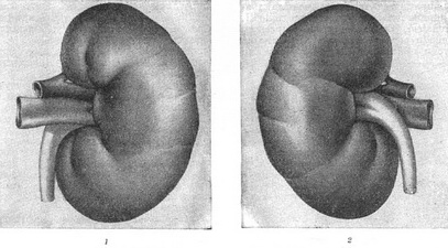 Рис. 2. Ліва нирка дорослого спереду (1) і ззаду (2).