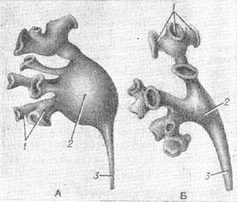 ![]() Рис. 5. Форми ниркових мисок: А - ампулярной; Б - дендрическая; 7 - чашечки; 2 - балія; 3 - сечовід. |