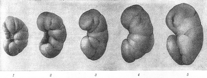 Рис. 1. Поступове зникнення ембріональної дольчатости нирки людини: 1 - нирка дитини 2 місяців; 2 - нирка дитини 6 місяців; 3 - нирка дитини 2 років; 4 - нирка дитини 4 років; 5 - нирка дитини 12 років.