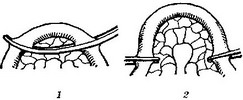 ![]() Рис. 3. Ізоляція ділянки кишки: 1 - одним зігнутим затиском; 2 - двома прямими затискачами. |