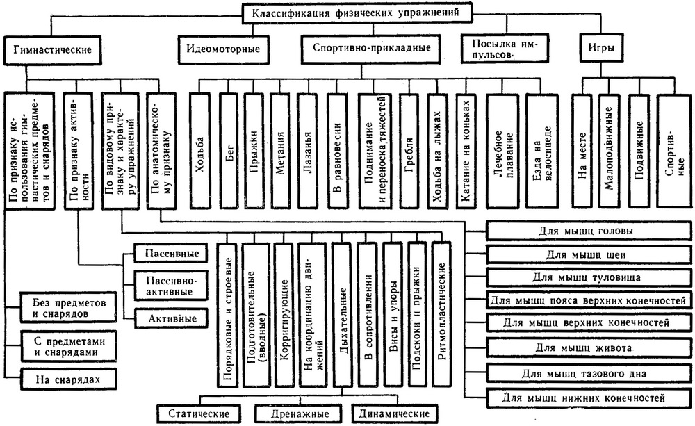 Фізичні вправи, що застосовуються з лікувальною метою, діляться на гімнастичні, идеомоторные, спортивно-прикладні вправи в посилці імпульсів до скорочення м'язів і гри (див. схему внизу сторінки).