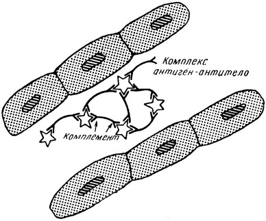 Рис. 3. Антитіла і антиген (у надлишку) в гуморальних середовищах утворюють комплекси. У присутності комплементу, ймовірно, ці токсичні комплекси викликають пошкодження капілярів, гладком'язових органів і т. д. |