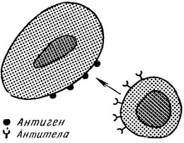 Рис. 4. Антиген адсорбований тканинами. Імунний фактор (еквівалент антитіл) розташований на поверхні специфічно змінених мононуклеарів. Ці клітини при з'єднанні з антигеном викликають пошкодження тканин. |