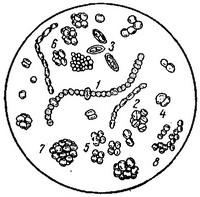 Форма і розташування коків: 1 - Streptococcus pyogenes (патогенний), переважають сферичні клітини; 2 - Streptococcus faecalis (слабопатогенный), переважають овальні клітини; 3 - Diplococcus pneumoniae (збудник крупозній пневмонії), клітини конічної форми, оточені капсулою; 4 - Neisseria gonorrhoeae (збудник гонореї), клітини у формі кавового зерна розташовуються попарно; 5 - Gaffkya, групи тетрад; 6 - сарцини, скупчення кубічної форми; 7 - Staphylococcus aureus (збудник гнійних процесів), скупчення неправильної форми; 8 - Staphylococcus zymogenes, безладні скупчення неправильної форми. |