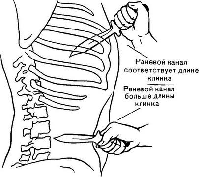 Глибина колото-різаної рани може залежати не тільки від глибини занурення леза, але і від області, де нанесено поранення (рис. 52). Нерідко дном рани є підлягає кісткова тканина. Занурення колючо-ріжучого предмета може бути обмежена і його рукояткою. Колючо-ріжучий предмет, проникаючи в черевну порожнину, може на відоме відстань зміщувати передню черевну стінку і проникати значно глибше, ніж, здавалося б, дозволяє довжина леза. У цих випадках може виявитися, що глибина рани більше, ніж довжина леза пошкоджуючого предмета. При колото-різаних ушкодженнях грудної клітини може виникати пневмоторакс, що призводить до зміщення органів і своєрідному «подовження» ранового каналу. Крім того, рановий канал може закінчуватися в порожнині органу (велика посудина, серце, трахея). Все це вносить певні труднощі при встановленні одного з важливих ознак пошкоджуючого предмета - довжини клинка.