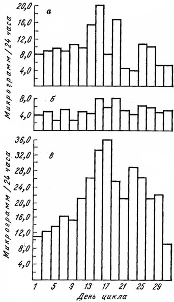 Рис. 7. Графічне зображення екскреції фракцій естрогенів при нормальному менструальному циклі (Е. І. Петранюк). а - екскреція естрону; б - естрадіолу, естріолу.