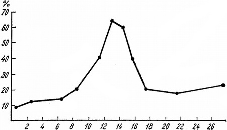 Рис. 8. Коливання каріопікнотіческого індексу протягом двофазного менструального циклу (за Zinser).