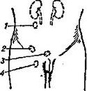 ![]() Затримка (1) і ектопія (2 - 4) яєчка при крипторхізмі: 1 - внутрішньочеревна; 2 - пахова; 3 - лобкова; 4 - стегнова.  |