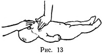 Масаж маленькій дитині здійснюється наступним чином: малюк лежить на спині, голова відводиться то в одну, то в іншу сторону (рис. 13); при масажі шиї з боку зміненої м'язи, притягує голову до плеча, застосовуються прийоми масажу, що послаблюють напруження м'язи, м'яко розтягують її; з іншого боку ший, там, де здорова м'яз, масаж повинен вести до підвищення м'язового тонусу. Масажем слід охоплювати і всі м'язи особи з боку кривошиї.