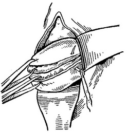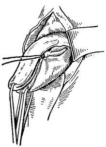 Рис. 118. Накладання швів на розрив шийки матки (за Фреунду).