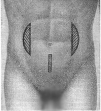 ![]() Рис. 1. Області для пункції черевної стінки при перитонеоскопии (заштриховані).  |