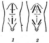 ![]() Найбільш часто вживані розрізи черевної стінки: 1 - по білій лінії живота над і під пупком; 2 - косі.  |