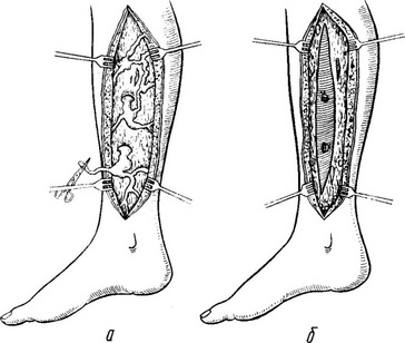Рис. 27. Етапи субфасціальної перев'язки надлодыжечных перфорирующих вен: а - виділення вен; б - перев'язка.