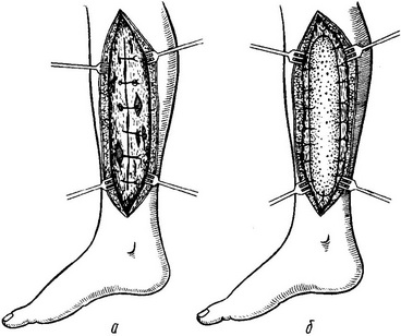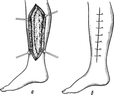 Рис. 28. Дубликатура фасції гомілки: а - зміцнення фасції; б - закриття рани.