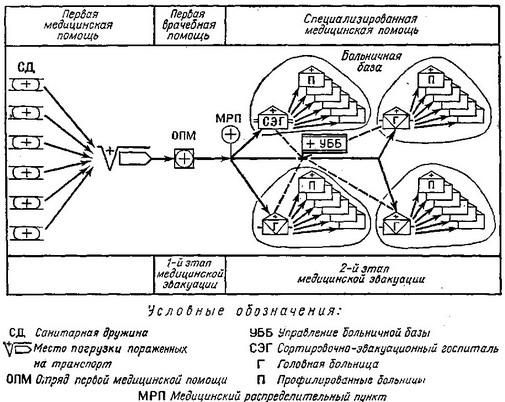 МСЦО, взявши на озброєння систему етапного лікування, передбачає розгортання двох етапів мед. евакуації: передового-загонів першої медичної допомоги (ОПМ) для надання так званої першої лікарської допомоги поблизу вогнищ масових уражень, та другого етапу - лікарняних баз (ББ) в заміській зоні (рис. 3). Найвищою формою медичної допомоги є спеціалізована. В період Великої Вітчизняної війни одним з найбільш яскравих досягнень військово-медичної служби з'явилася організація спеціалізованої медичної допомоги, яка надавалася в армійському районі, тобто на третьому етапі. В умовах же ГО виникають всі можливості для надання такої допомоги вже на другому етапі евакуації - в ББ.