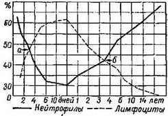 ![]() Кількість нейтрофілів і лімфоцитів в різні періоди дитячого віку (у відсотках): а - перший перехрест; б - другий перехрест. |