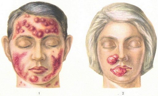 Шкірні прояви лейкозів бувають специфічними і неспецифічними. Специфічні зміни обумовлені розростанням в шкірі патологічної кровотворної тканини. В більшості випадків шкірний пролиферат складається з лейкозних клітин, відповідних тій або іншій формі лейкозу. Клінічно специфічні зміни шкіри проявляються вузликовий і вузлуватими (пухлиноподібними) новоутвореннями (рис. 1 і 2), виразково-некротичними змінами на місці руйнування лейкозного пролиферата, частковим або універсальним почервонінням шкіри.
