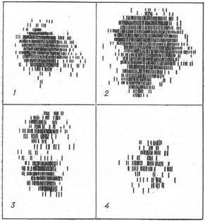 ![]() Сканограми лімфатичного вузла: 1 - нормально функціонуючого, 2-в стані гіперплазії; 3 - з частковим метастатичним ураженням; 4 - повністю заміщеного метастазом.  |