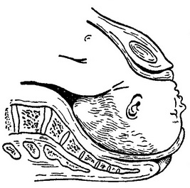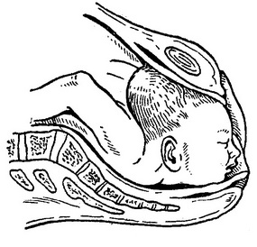 Рис. 91. Лицьове передлежання. Прорізування голівки.