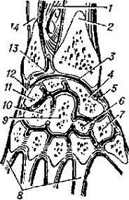 ![]() Розпил правої кисті: 1 - міжкісткова перетинка; 2 - променева кістка; 3 - променевозап'ястний суглоб; 4 - човноподібна кістка; 5 та 12 - бічні променева і ліктьова зв'язки зап'ястя; 6 і 7 - мала і велика трапецієвидні кістки; 8 - п'ясткові кістки; 9 - головчаста кістка; 10 - крючковатая кістка; 11 - тригранна кістка; 13 - суглобовий диск; 14 - ліктьова кістка. |