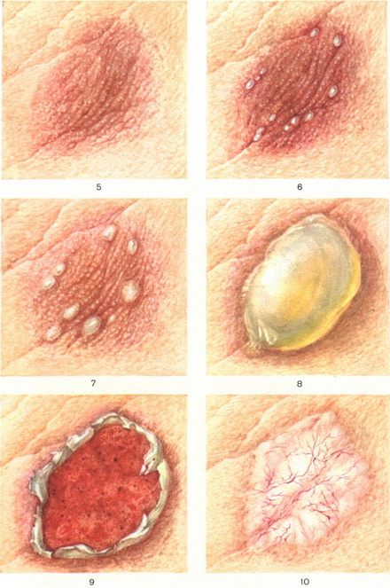 Рис. 5-10. Променеві ушкодження шкіри (розвиток променевих опіків). Рис. 5. Еритема. Рис. 6 - 8. Розвиток бульбашок. Вологий радиоэпидермит. Рис. 9. Ерозія. Рис. 10. Рубець; видно дисхромия, телеангіектазії і облямівка гіперпігментації.