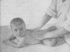 рахітом (за винятком періоду розпалу при гострому перебігу з явищами гіперестезії), пневмонію. Користуються такими прийомами масажу: погладжування, розтирання, поверхневе і глибоке розминання, легке постукування і вібрація. Погладжування (рис. 21 і 22) є основним прийомом М. у дітей раннього віку; їм зазвичай починають і закінчують процедуру. Деякі діти під впливом погладжування швидше засинають, їх сон стає глибоким і тривалим. Розтирання - це те ж, що погладжування, але при більшому тиску
