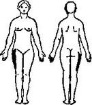 ![]() Області зниження больової і тактильної чутливості і парестезія у верхній третині стегна (зафарбовані чорним). |