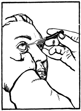 Щоб закласти в кон'юнктивальний мішок мазь, її беруть на лопаточку скляної палички, відтягують нижню повіку і в область нижнього склепіння кладуть паличку з маззю (рис. 60). Потім повіки закривають, скляну паличку повільно видаляють вбік, а очне яблуко через повіку легко масажують, щоб мазь розподілилася рівномірно.