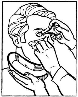 3. Наливають у спеціальну очну ванночку до країв потрібний розчин і, притиснувши краю чарочки до кісткових стінок орбіти, змушують хворого моргати.