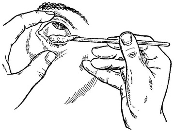 Іноді кон'юнктиви повік змазують сульфатом міді або галуном у вигляді очних олівців. При цьому треба ретельно перевірити, чи немає гострих країв у очного олівця. Перед вживанням олівець необхідно протерти вологою ваткою з дезинфікуючим розчином.