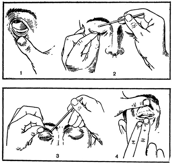 Рис. 40. Огляд сполучної оболонки. 1 - відтягування нижньої повіки; 2 - вивертання верхньої повіки - перший етап; 3 - вивертання верхньої повіки - другий етап; 4 - вивертання верхньої повіки для огляду верхньої перехідної складки.