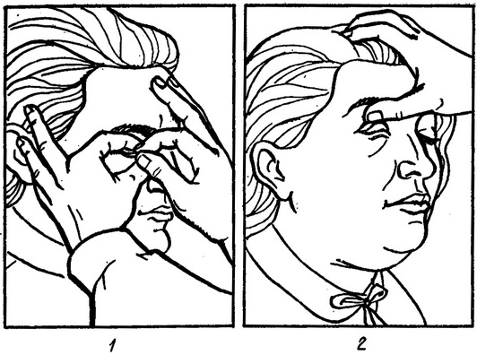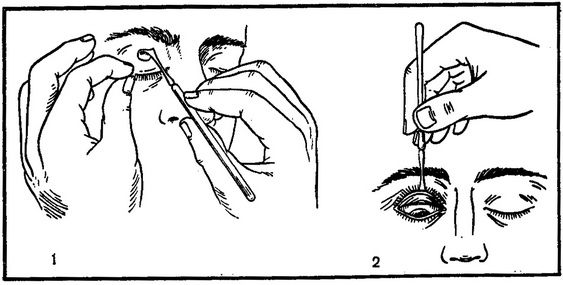 Рис. 41. Вивертання верхньої повіки (два моменти). 1 - перший момент; 2 - другий момент.