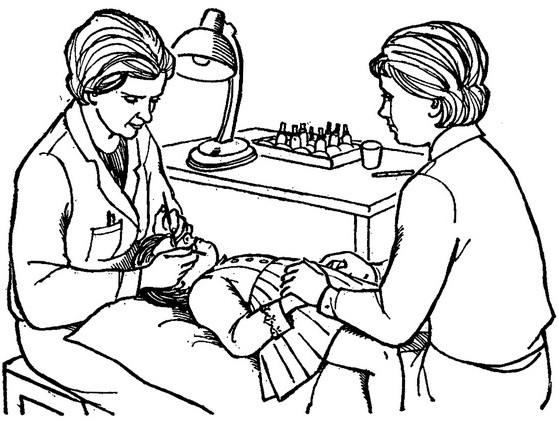 Обстеження маленьких дітей роблять наступним чином: мати садовить дитину собі на коліна спиною до лікаря, а потім кладе дитину спиною на коліна лікаря (рис. 43). Лікар фіксує голову дитини трохи розсунутими колінами, мати тримає ліктями на коліна дитини, а руками його руки. Таким чином, обидві руки у лікаря вільні і він може виробляти будь-яке обстеження.