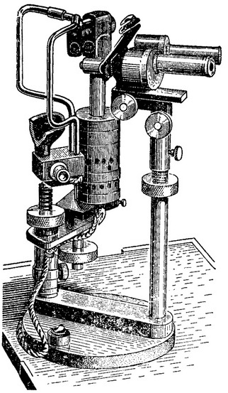 Дуже зручно розглядати освітлені ділянки або взагалі проводити огляд за допомогою лупи, одягненою на голову лікаря. Для цієї мети застосовують бінокулярну лупу (мал. 45). Для більш точних досліджень очі останнім часом широко використовують метод біомікроскопії з допомогою щілинної лампи (рис. 46). Цей апарат дуже складного пристрою, для користування їм необхідні спеціальні знання.